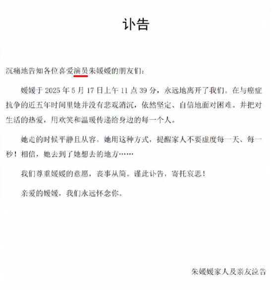 辛柏青发布的讣告第一行写着“演员”朱媛媛,而不是“妻子”,这个称呼已经胜过了千言万语。金鹰奖、华表奖、金鸡奖、百花奖,她几乎拿遍国内重要表演奖项。或许在丈夫的心中,演员这个身份才最能代表她的一生。