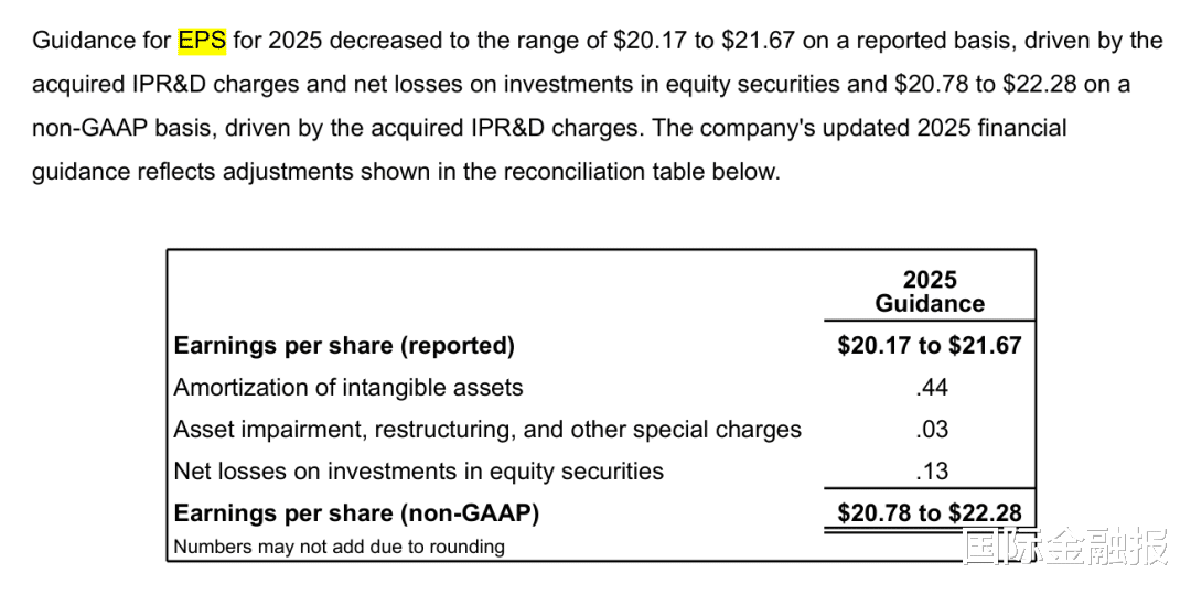 礼来将2025年每股盈利(EPS)预期从此前22.50-24美元的指引降至20.78-22.28美元。礼来称,这一变化是收到收购在研无形资产(IPR&D)费用的影响,主要来自从Scorpion Therapeutics收购的一款口服抗癌药。