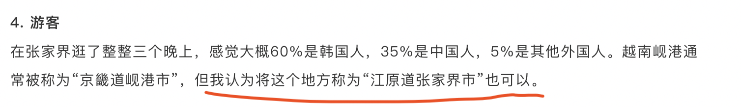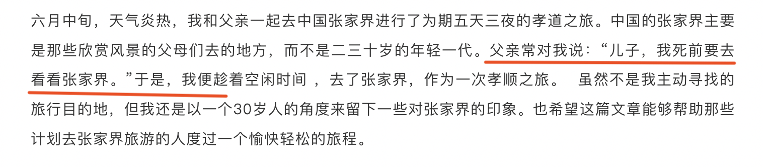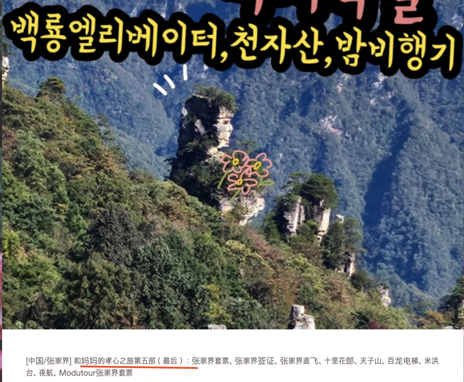 更绝的是,张家界旅行社把登山和“孝道”绑在一起营销。在韩国,送父母去张家界旅游≈孝子认证,不去≈不孝。景区甚至打出广告:“不孝有三,不带爹妈爬张家界为大!”这招直接戳中东亚家庭痛点——现在张家界70%的韩国游客是银发族,人均被子女“孝”过来的。(以下图片是从外网的韩国人游记里截图来的)