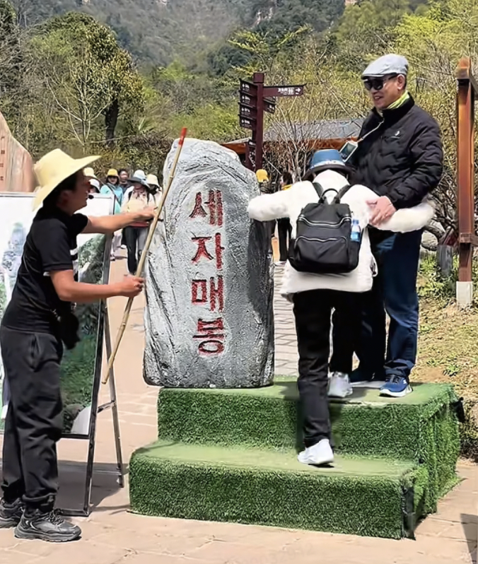 大家刷短视频,也能看到张家界景区里挤满了韩国游客——阿婆们戴着墨镜、背着登山包,对着奇峰怪石疯狂比心,大爷们操着韩式英语求路人拍照,场面比韩剧还热闹。