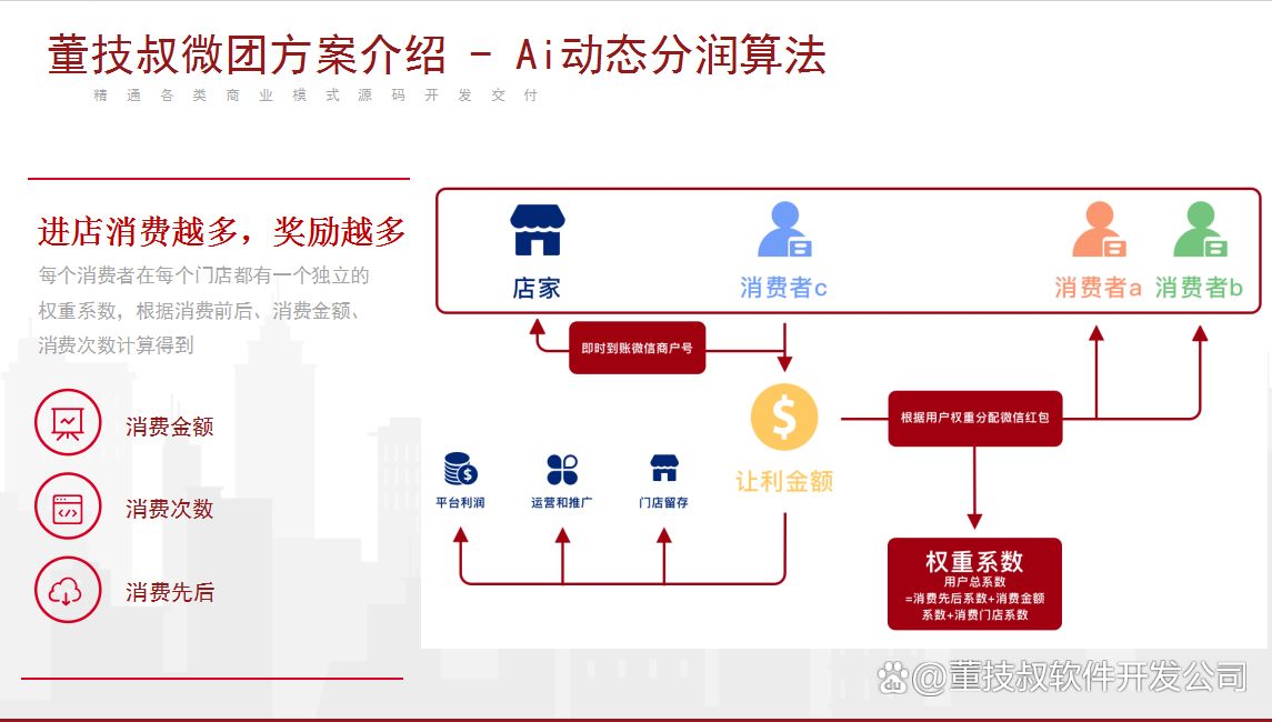 用户红包金额 = 消费金额 × 商家让利比例 × 红包分配比例 × 个人权重系数 / 店内总权重