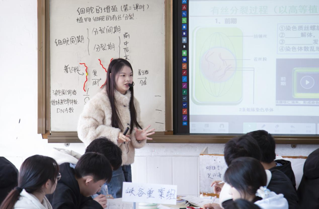生物教师胡玮姗在《植物细胞的有丝分裂》一课中,通过图片、视频直观讲解分裂时期特点,并创编记忆顺口溜帮助学生识记;随后组织学生用扭扭棒制作分裂模型并展示,将微观知识宏观化,在动手实践中深化理解。数学教师洪勇则从“兔子繁殖”趣味问题切入《斐波那契数列与黄金分割》,引导学生自主推导数列规律,再结合生活实例与短视频,展现黄金分割在五角星、向日葵等事物中的应用,让学生领略数学之美。