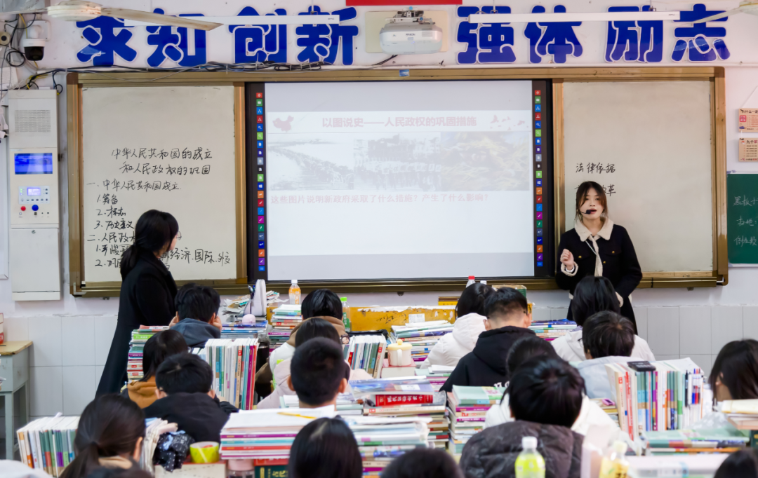 历史课堂,张梦姿老师巧用开国大典录像导入,瞬间将学生带入波澜壮阔的历史场景。课堂中,她依托全国解放路线图、土地改革实景图等丰富史料,搭配英雄事迹分享与文献摘录解读,将新中国成立与政权巩固的历史脉络具象化;同步穿插课堂练习、分组探究与高考真题拓展,实现学练结合,有效提升学生的史料分析与合作探究能力。