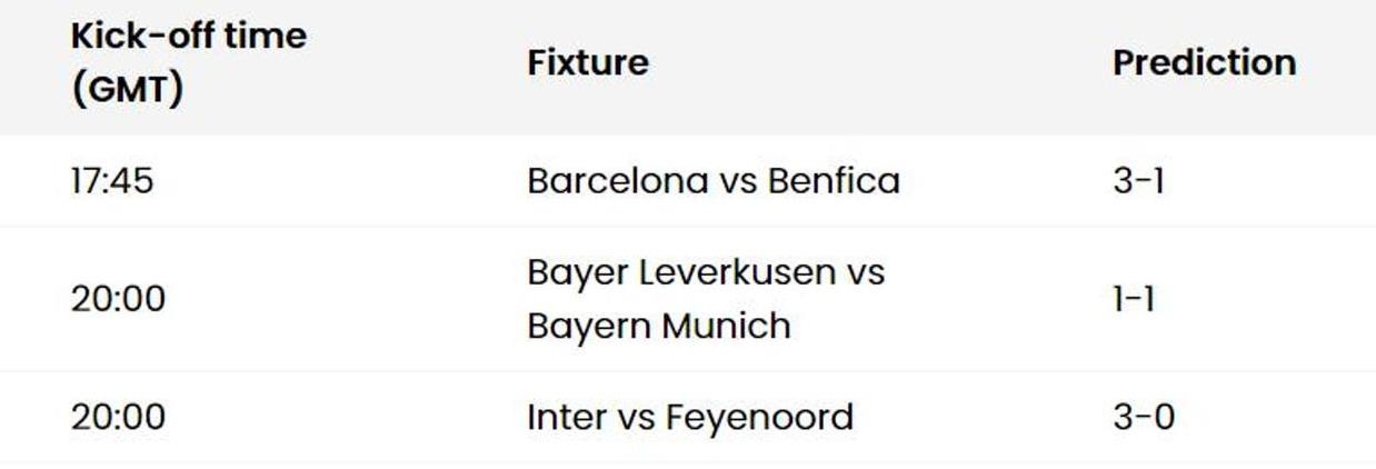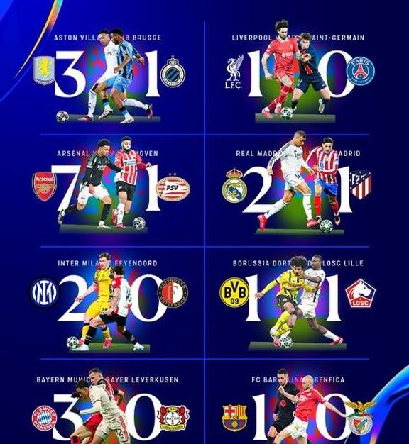 欧冠小组赛综述巴塞罗那 3-0 本菲卡巴黎圣日耳曼 3-1 利物浦费耶诺德 0-2 国际米兰拜仁慕尼黑 2-0 勒沃库森(加时)马特乌斯预测回顾:8场中4场方向正确,但比分未全中。费耶诺德 1-2 国际米兰:方向正确,实际0-2。巴黎圣日耳曼 2-1 利物浦:错误,实际0-1。本菲卡 1-2 巴塞罗那:方向正确,实际0-1。拜仁慕尼黑 2-1 勒沃库森:方向正确,实际3-0。