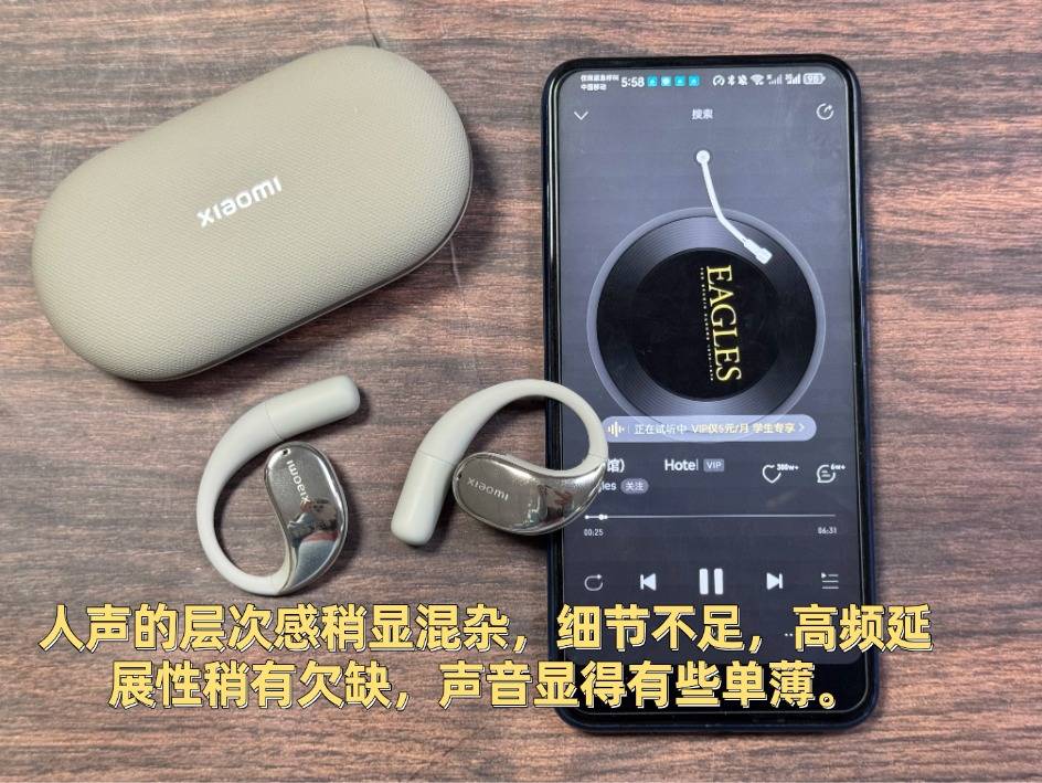 小米开放式耳机搭载了 17×12mm 跑道型单元,整体音量感较为充足,低频下潜尚可,能提供一定的氛围感。试听《加州旅馆》时,前奏的吉他弹拨较为清晰,人声部分也能较好地呈现,但在副歌阶段,器乐与人声的层次感稍显混杂,细节解析度略显不足,尤其是高频延展性稍有欠缺,使得部分声音显得有些单薄。此外,由于开放式设计的特性,耳机在嘈杂环境下的声音表现会受到一定影响,在室外使用时可能会有背景噪音干扰听感。