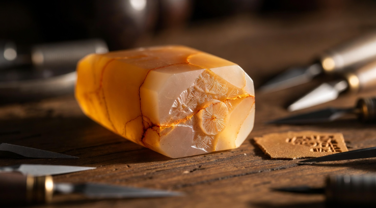 那天我去福州的老篆刻工作室拜访老师傅。工作室里弥漫着墨香,墙上挂着印屏。师傅从保险柜中取出一个锦盒,打开锦盒,一个小橘黄