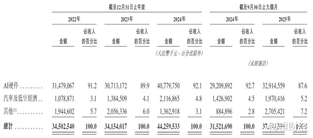2022年—2024年及2025年前三季度,领益智造的汽车及低空经济业务分别实现收入10.79亿元、13.85亿元、21.17亿元和19.7亿元,对各期收入的贡献率分别为3.1%、4.1%、4.8%和5.2%。