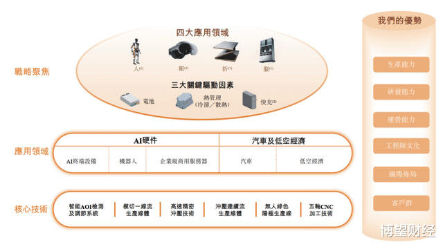 从收入结构看,公司业务主要分为AI硬件、汽车及低空经济,以及其他业务三大板块。其中,AI硬件业务是绝对支柱,涵盖了从材料、功能件、模组到成品组装的一站式解决方案,产品覆盖智能手机(含折叠屏)、平板、笔记本电脑、智能穿戴、AI/XR设备、服务器及智能机器人等。
