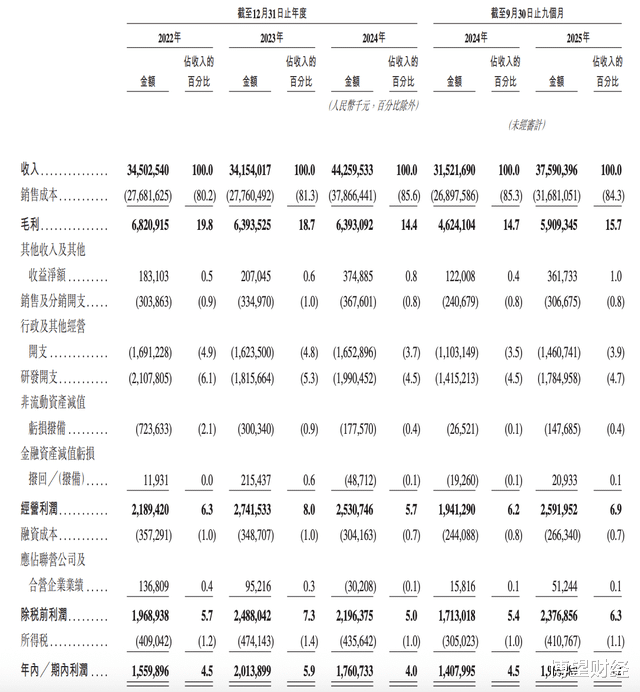 营收方面,2022年至2024年及2025年前三季度分别为约345.03亿元、341.54亿元、442.6亿元和375.9亿元。其中2023年营收同比微降1%,2024年大幅反弹增长约29.6%,而2025年前三季度增速又放缓至约19.3%。