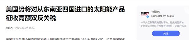 原文记载于金融界2025.04.22关于:美国势将对从东南亚四国进口的太阳能产品征收高额双反关税