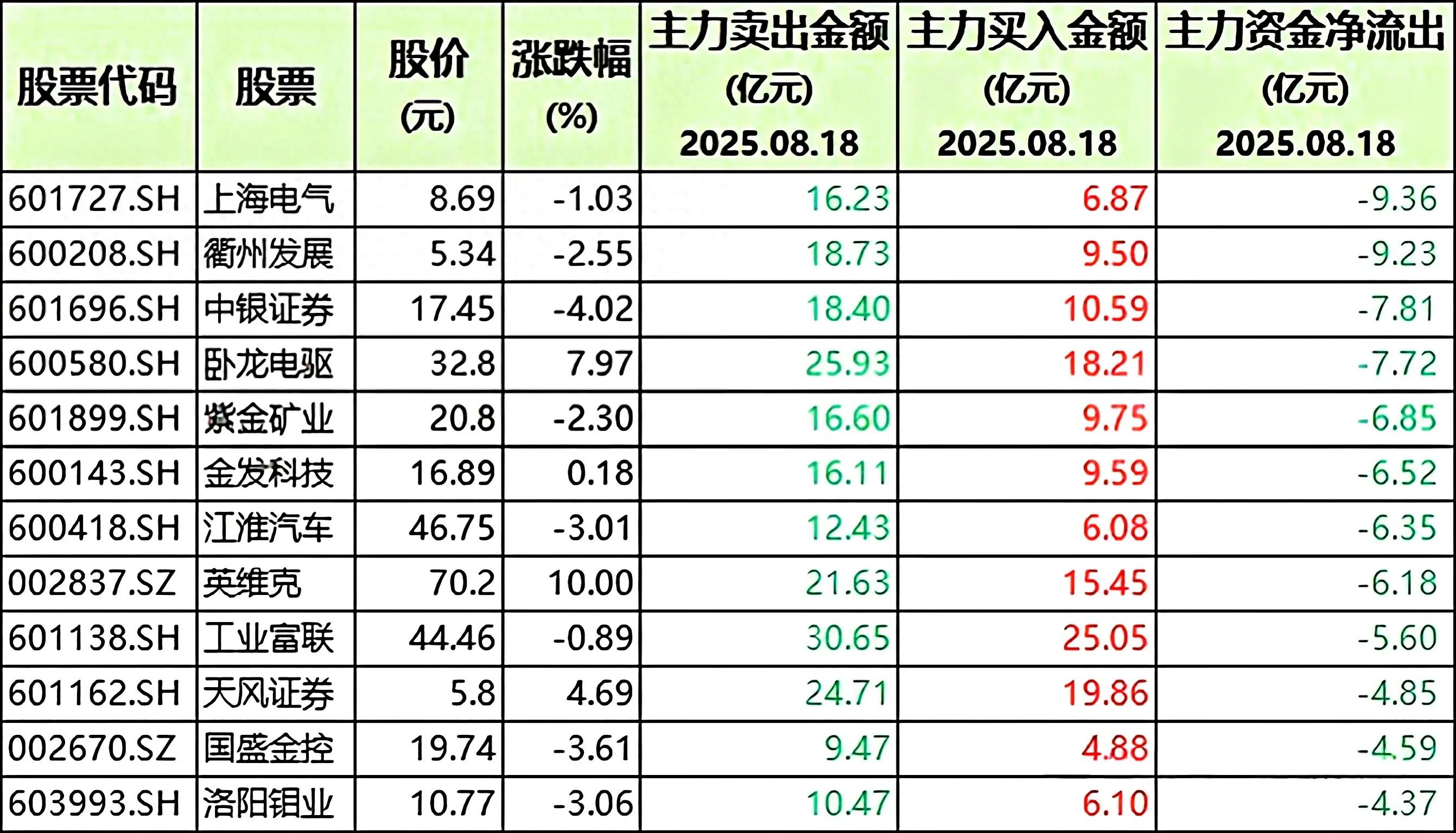 先从第一张图的狠角色说起:上海电气主攻发电设备和新能源装备制造,作为行业龙头,这次被主力大手笔甩卖,卖出额高达16亿多,买入却不到7亿,净流出9.36亿。这种量级在平常不多见,暗示了短期资金在高位套现。紧随其后的是衢州发展,这家地方性综合企业涉及基建和投资,净流出9.23亿;还有中银证券,证券行业的头部玩家,净流出7.81亿,显示金融股正承受压力。卧龙电驱专精电机驱动设备,股价虽然大涨近8%,还是被主力抛了7.72亿,典型的“边拉边跑”战术。