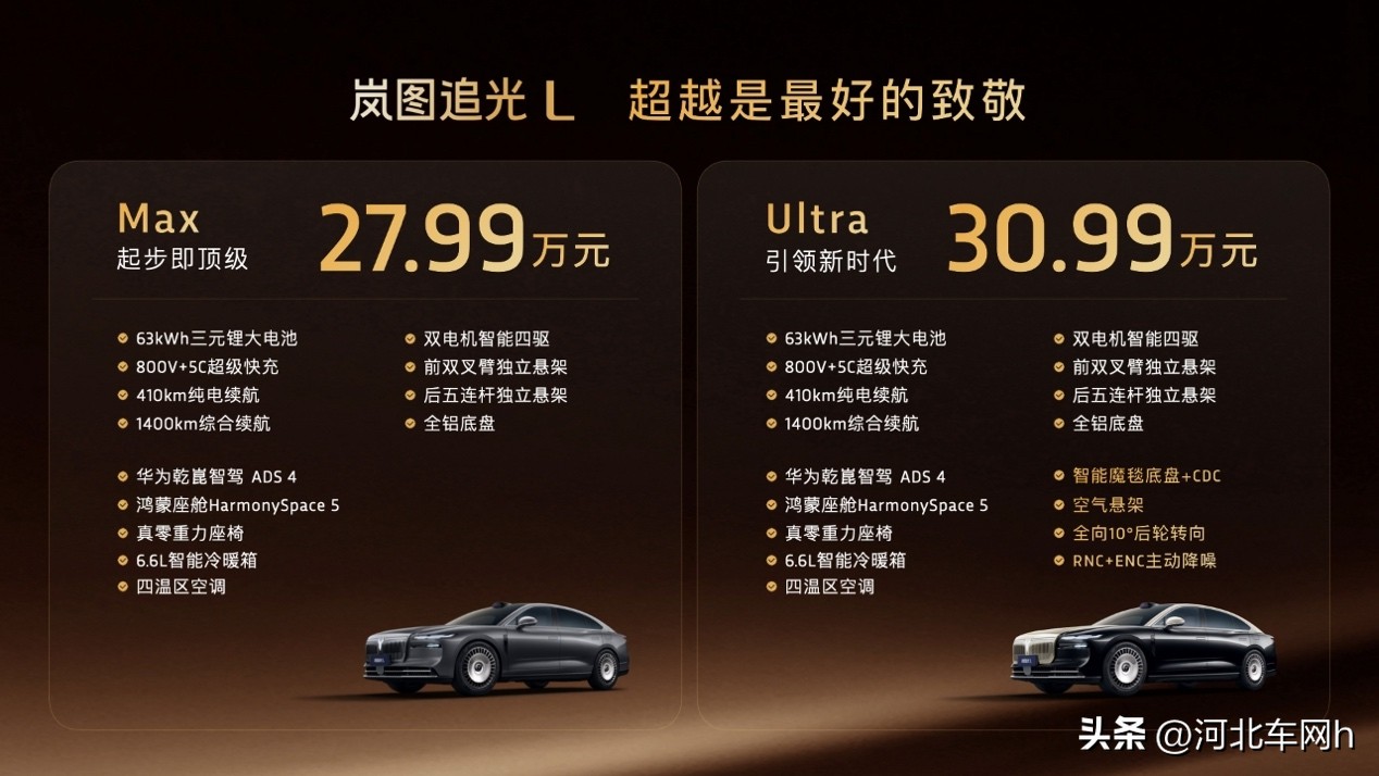 12月10日,新时代旗舰轿车——岚图追光L正式上市,共推出2款版型,售价分别为Max版27.99万元、Ultra版30.99万元。