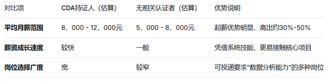 这张表清晰地揭示,获得CDA认证,意味着在职业生涯起点就占据了薪酬高地。