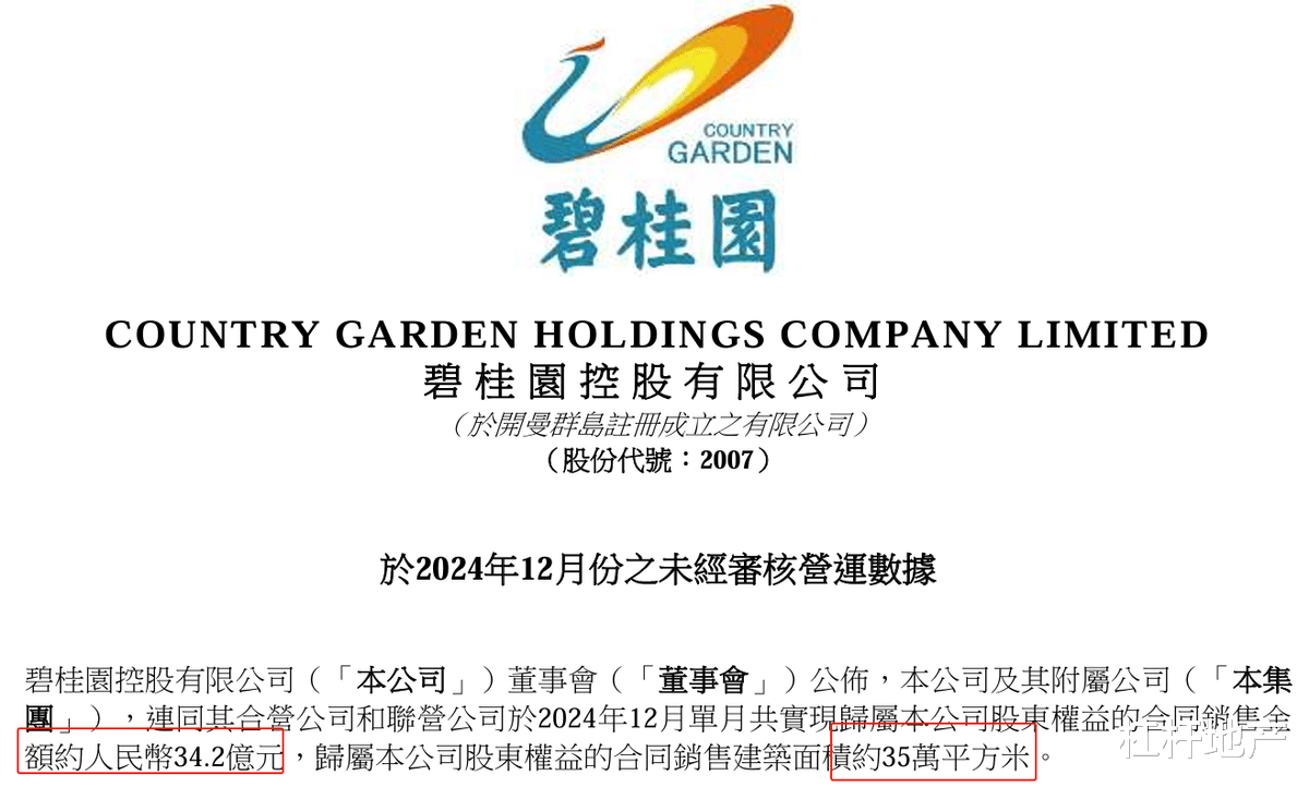 前不久披露的销售数据显示,碧桂园2024年12月权益销售额约34.2亿元,销售面积约35万平米;2023年同期这两个数据分别为69.1亿元、68万平米。同比分别下滑50.5%、48.5%。