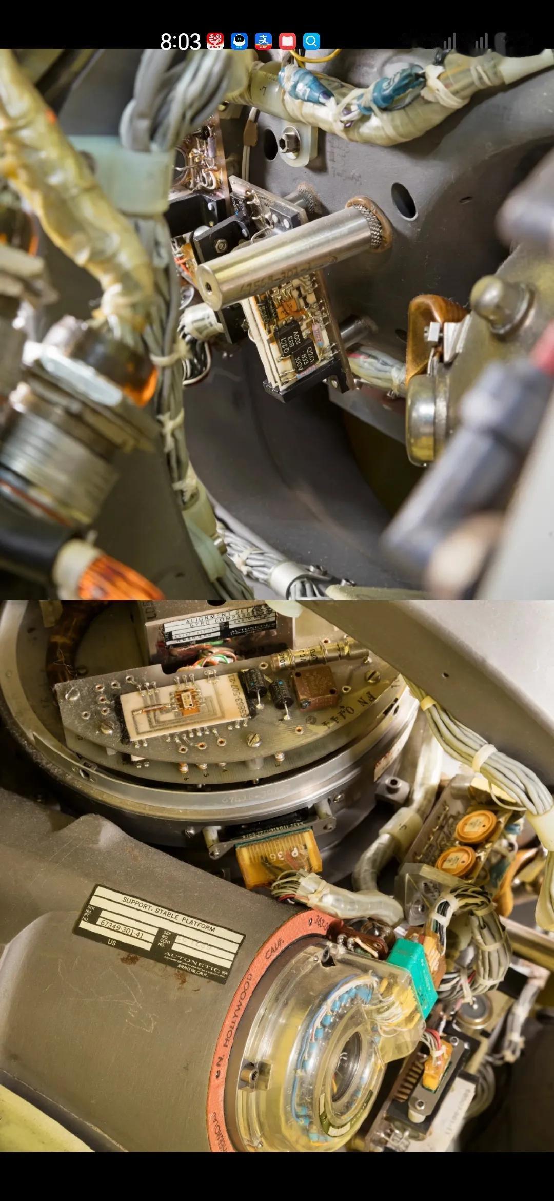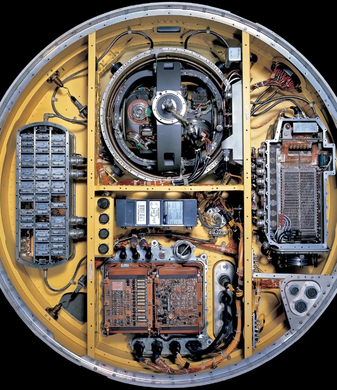 上图是民兵导弹的制导舱,上中是陀螺仪,右侧是寄存器,左侧是制导计算机,下中是P92放大器/电子控制组件。