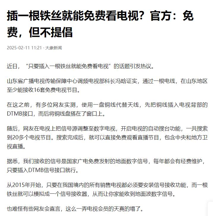 信息来源:插一根铁丝就能免费看电视?官方:免费,但不提倡