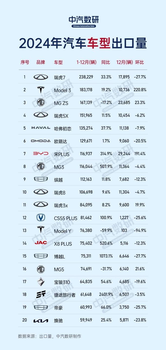 2024年,整车出口前十企业中,从增速上来看,比亚迪出口43.3万辆,同比增长71.8%;长安出口53.6万辆,同比增长49.6%;江淮出口24.9万辆,同比增长46.7%。