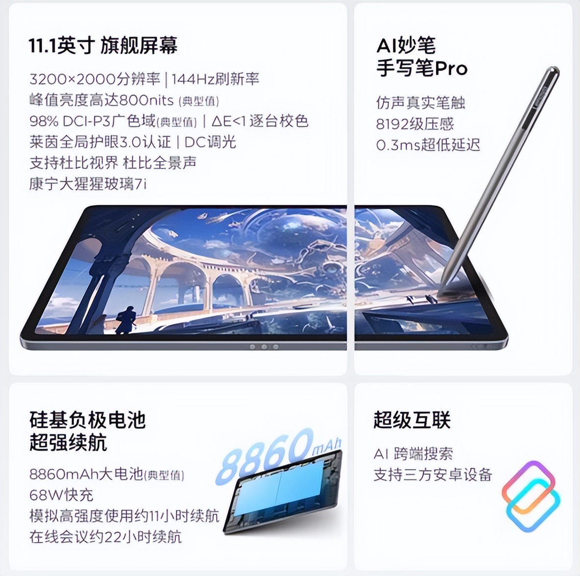 对于觉得8.8寸Y700屏幕过小,主流12-13寸的大平板屏幕又过大的朋友来说11.1寸可能会是更好玩游戏和握持便携性完美平衡的尺寸。另外还有杜比视界与杜比全景声,康宁大猩猩玻璃7,机身重量458g,薄至5.99mm,内置8860毫安大电池+68W快充。首发好评晒单还送599元联想手写笔Pro,仿真实笔触+8192级压感+0.3ms超低延迟。