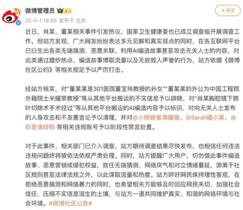 微博的这篇辟谣发布于5月1日晚上6点50分,辟谣的也是为网友们最为关注的核心点有两个,“董某某是301医院董宝玮教授的孙女”“董某某的外公为中国工程院外籍院士米耀荣教授”,微博称这些说法是从其他平台搬运的不实信息。