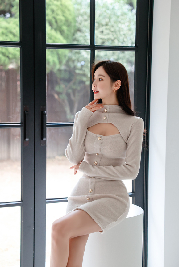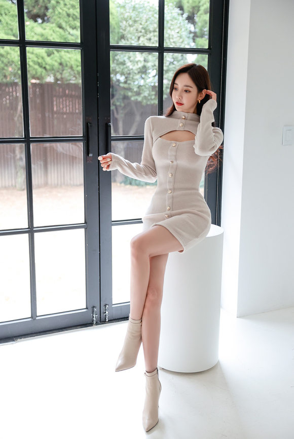 这件连衣裙的设计非常独特,采用了高领和长袖的设计,不仅增添了一份优雅,还能够在视觉上拉长颈部线条,使她的颈部显得更加修长。裙子的腰部设计紧贴身形,完美地勾勒出女孩的曼妙身姿,展现出她的身材优势。裙子的长度恰到好处,既不会过于保守,也不会过于暴露,完美地展现了她的腿部曲线。