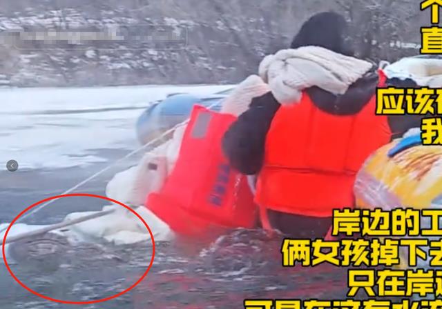 两个女生已经很冷静了,没有乱扑腾只是安安静静地紧拽绳子保持平衡等待救援,河里时不时就会漂过来很多冰块,难以想象当时河里会有多么冰冷。