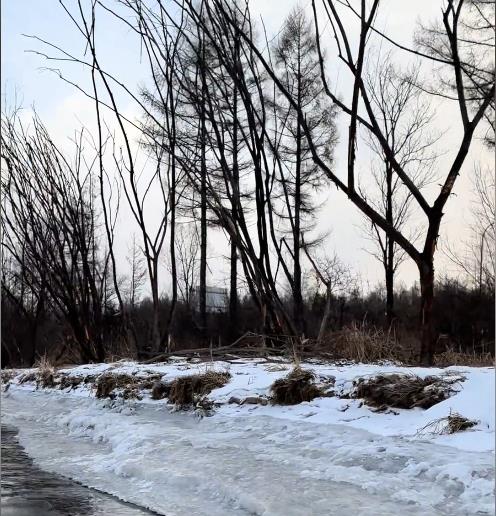 靠岸的水面结了一层厚厚冰,两岸上的树木光秃秃的天空也冷的泛白,给人一种寒冷萧条的感觉。