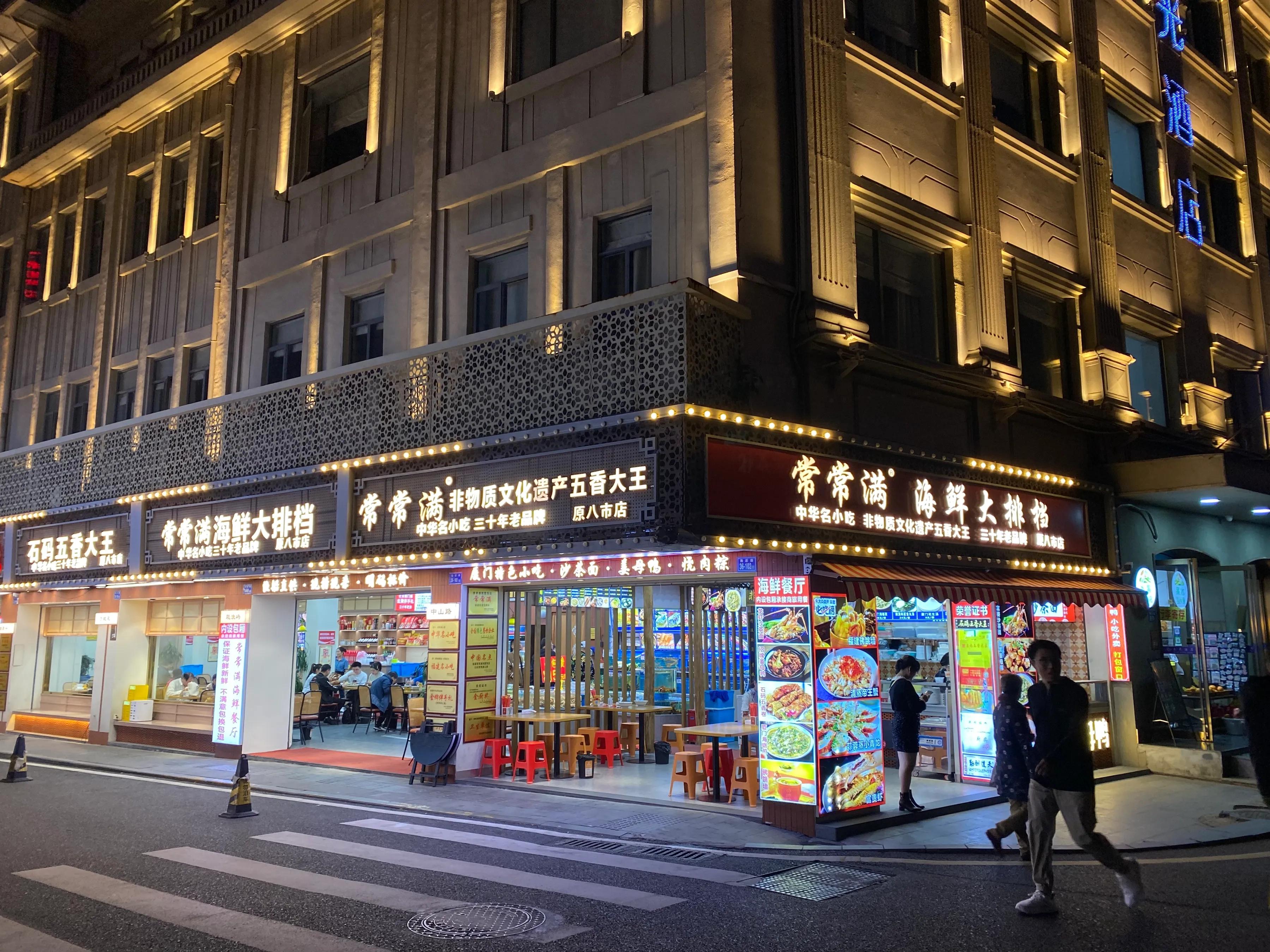 就在轮渡码头斜对面的常常满海鲜大排档,也很适合来厦门的第一餐就直接来这的!去完鼓浪屿下了轮渡步行来这吃完继续逛中山路也是非常合适的路线。交通方便,海鲜池各种鲜活海鲜,都是明码标价又新鲜,现捞现做,还有各种闽南小吃,都能在这吃到的!