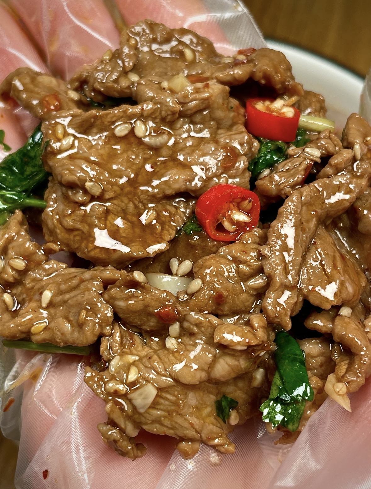 调酱汁是魔法时刻。碗里放两勺生抽、半勺香醋、半勺鱼露、一小勺糖、半勺辣椒油、再来五滴花椒油、蒜末和小米辣圈圈按胆量随意,最后挤半个青柠檬汁,酸、辣、鲜、香、麻五重奏齐活。把冰镇牛肉沥干水分,倒进酱汁里翻拌,每一片肉都裹上琥珀色外衣,再倒入香菜、半个紫洋葱丝、一把炸花生米,筷子一搅,香菜的清新、洋葱的甜脆、花生的焦香同时起飞,鼻子先吃到夏天。