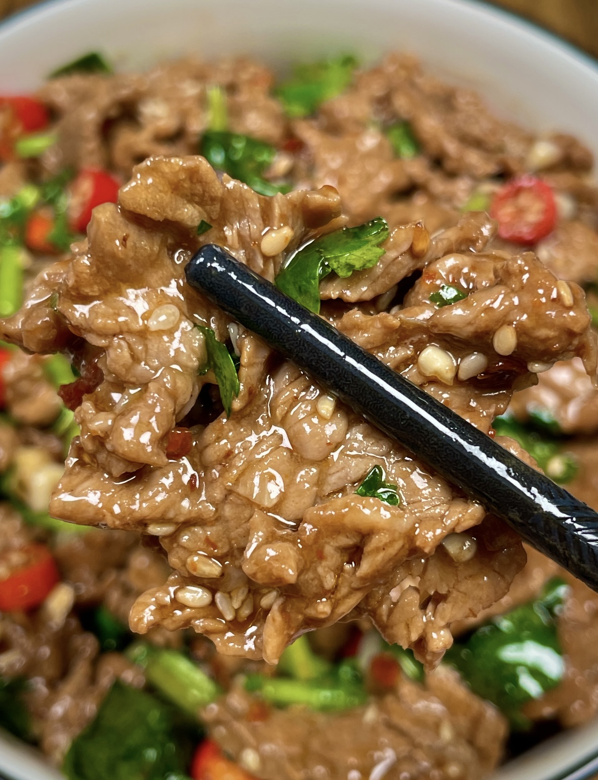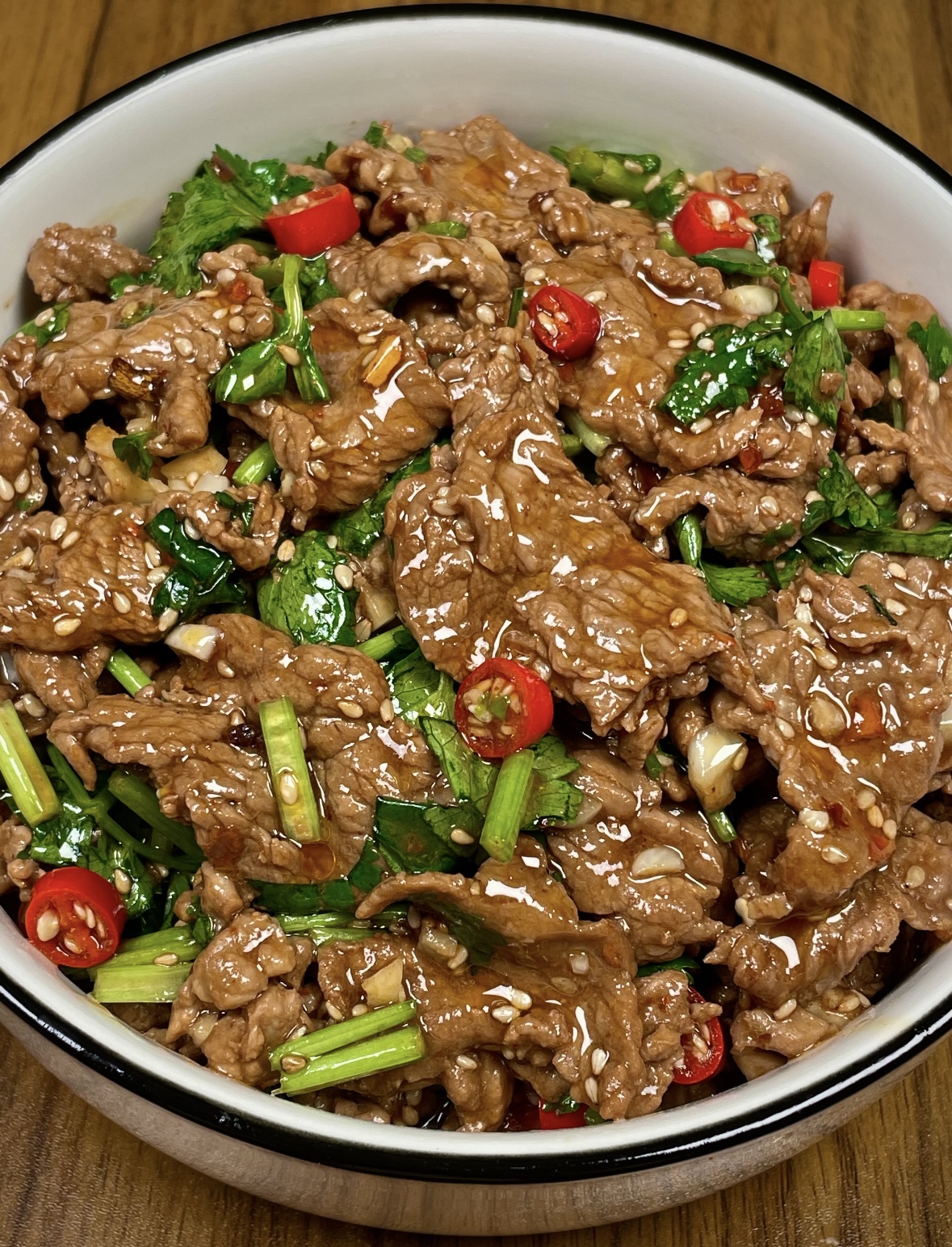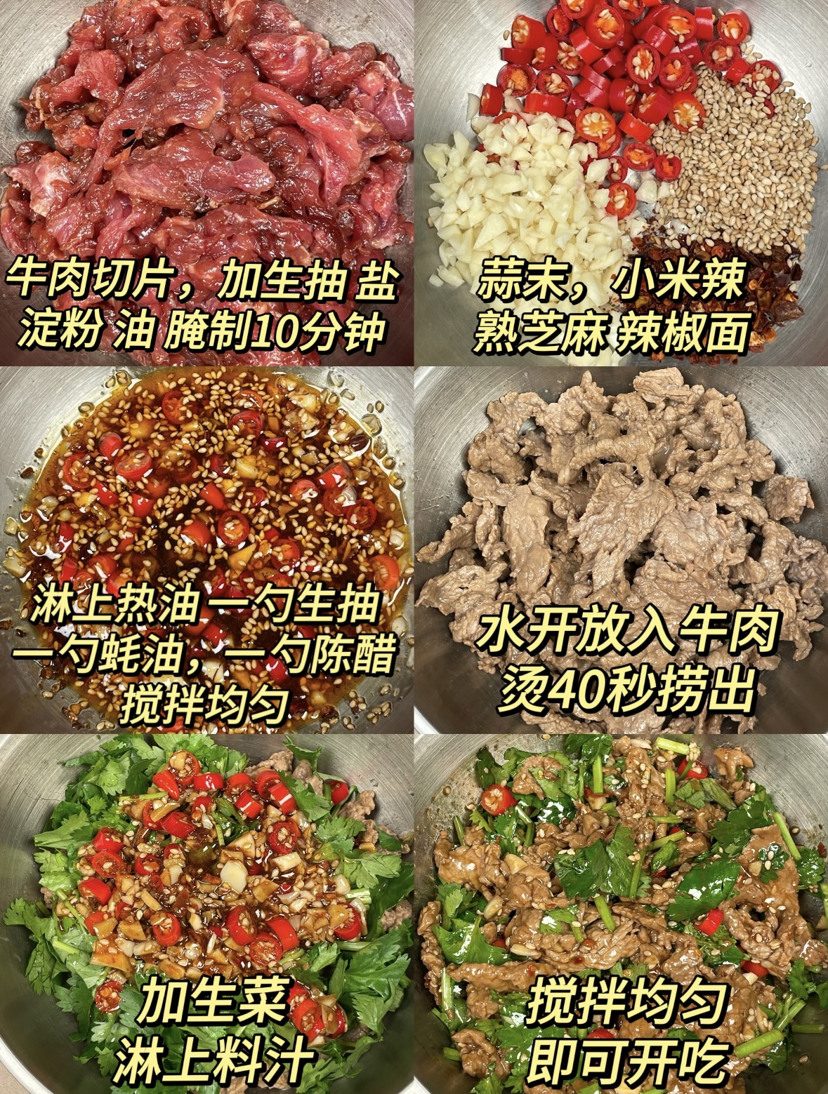 装盘别学餐厅那种小碟子小气吧啦,直接拿汤盆,把拌好的牛肉堆成小山,顶上再撒一把新鲜香菜叶和熟白芝麻,红绿白三色撞色,拍照连滤镜都省。第一口建议你别配饭,空口吃,让酸辣汁在舌尖打鼓,牛肉嫩得几乎要滑进喉咙,香菜的青草气像一阵风刮过,把油腻全卷走,紧接着花椒的酥麻才慢半拍爬上嘴角,吃得人直眨眼睛,却停不下筷子。我家那位平时不吃香菜的直男,吃完默默把盆端走,说“这玩意儿比薯片还上头”。