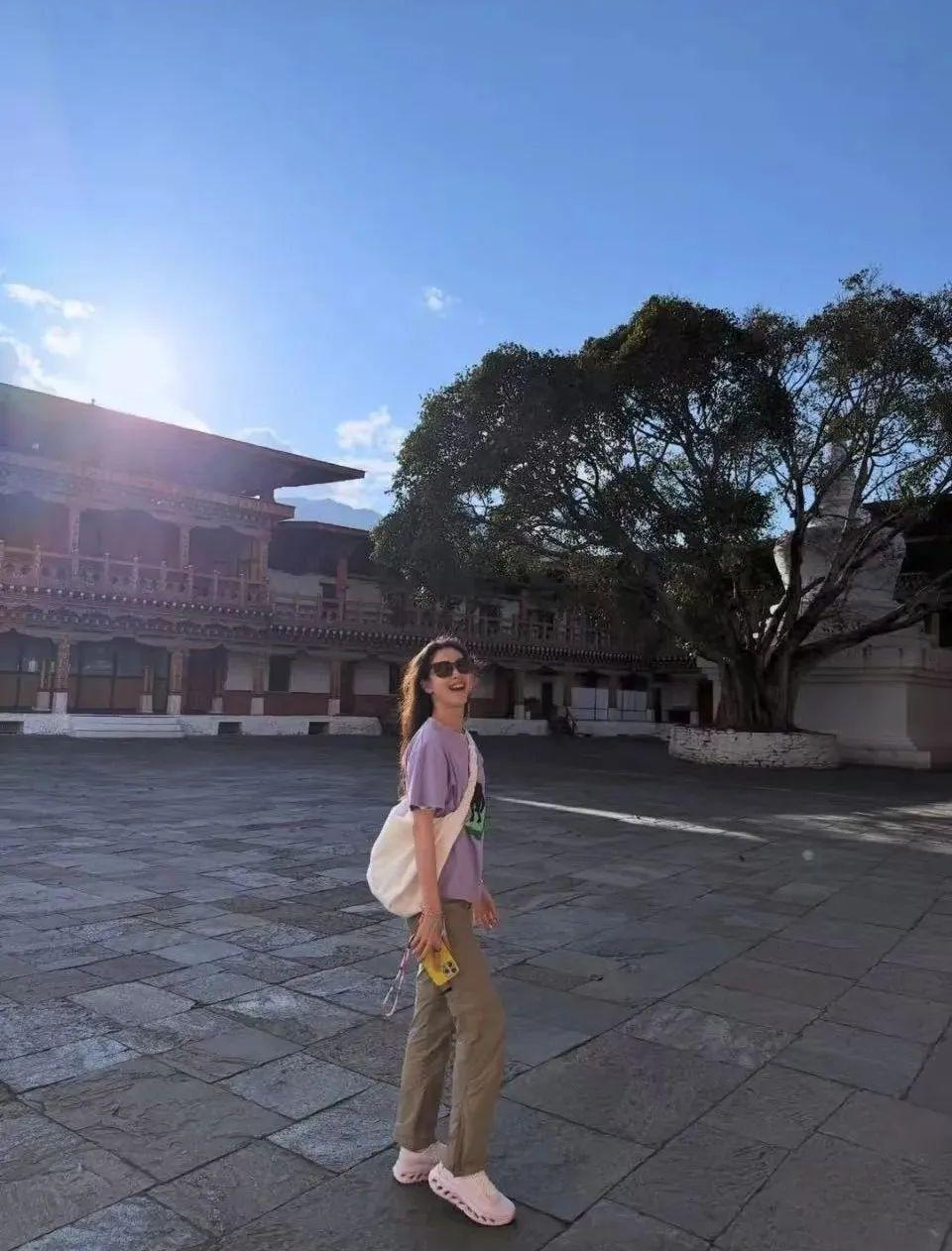 照片中的章泽天身处不丹,这个充满神秘色彩的国度为她的旅行照增添了独特的背景。她穿着休闲T恤搭配舒适长裤,外面套着一件实用的冲锋衣,背着登山包,手持登山杖,完全是一副准备征服山川的户外爱好者模样。这样接地气的穿搭,与以往出席各种活动时的华丽装扮截然不同,却让人感受到她对旅行的热爱和全身心投入。