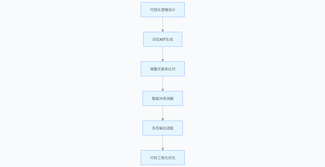 1. 动态 AST 生成技术ANTLR4 实时生成:支持 53 种可视化操作映射,某政务审批系统逻辑变更到代码更新延迟控制在 200ms 以内。增量式差异比对:仅重新生成变更节点代码,编译效率提升 3 倍。2. 智能冲突消解机制语义感知冲突检测:结合依赖关系图谱,教育 SaaS 系统并行开发冲突解决时间从 4 小时缩短至 20 分钟,策略推荐准确率达 92%。3. 多态输出适配技术128 个语言适配模块:支持 React/Vue 前端与 Spring Boot/Node.js 后端代码生成,某跨境电商项目多端代码一致性达 99.8%。(二)代码工程化优化技术代码压缩与混淆:前端采用 UglifyJS 压缩体积减少 40%,后端通过 ProGuard 优化使执行效率提升 15%。自动文档生成:基于 JSDoc/Swagger 生成 API 文档,文档覆盖率从 30% 提升至 95%。三、十万级节点的性能工程实践(一)可视化引擎性能优化体系iVX 的可视化逻辑引擎在大规模场景下实现技术突破,其性能优化架构如图 4 所示: