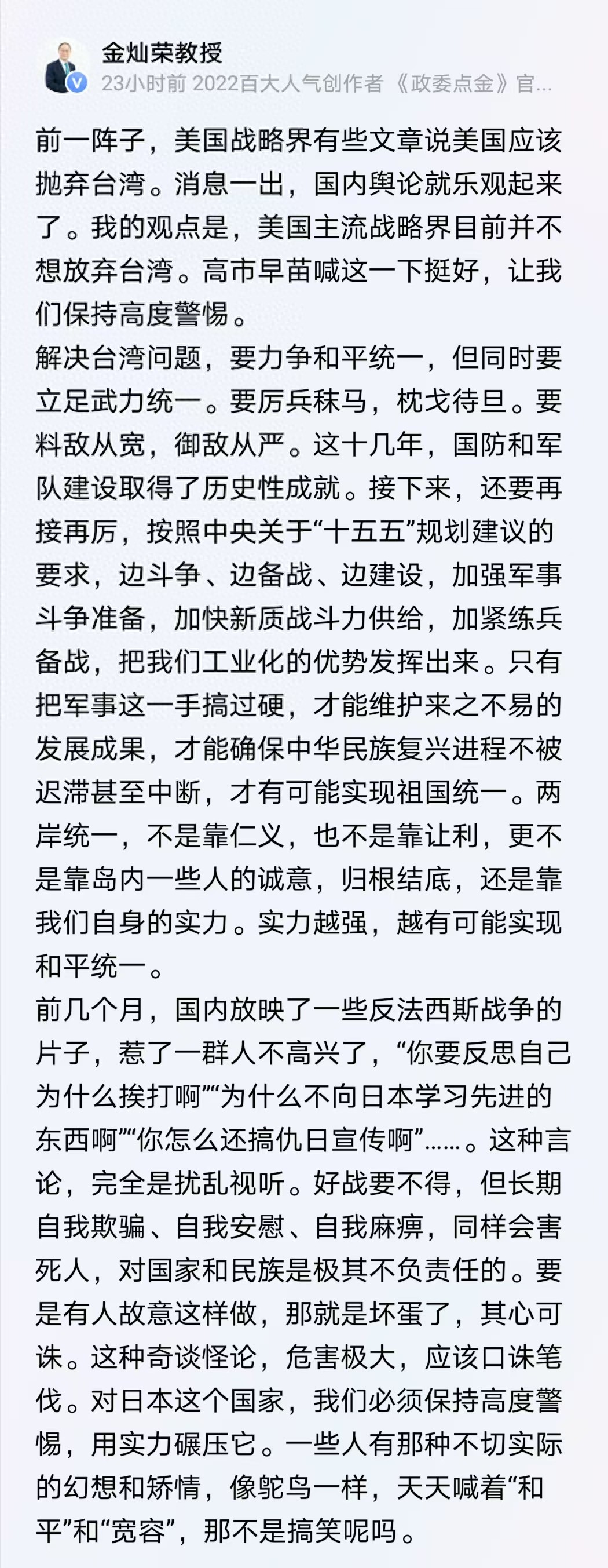 金灿荣说,从前段时间美国的表现来看,包括美国的战略界有些人也认为,美国应该抛弃台湾。