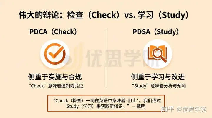 但戴明本人对“Check”这个词一直不太满意。他更倾向用Study。不是简单地看结果对不对,而是要研究:为什么会是这个结果?和原来的预测差在哪里?我们对系统的理解是不是要改?