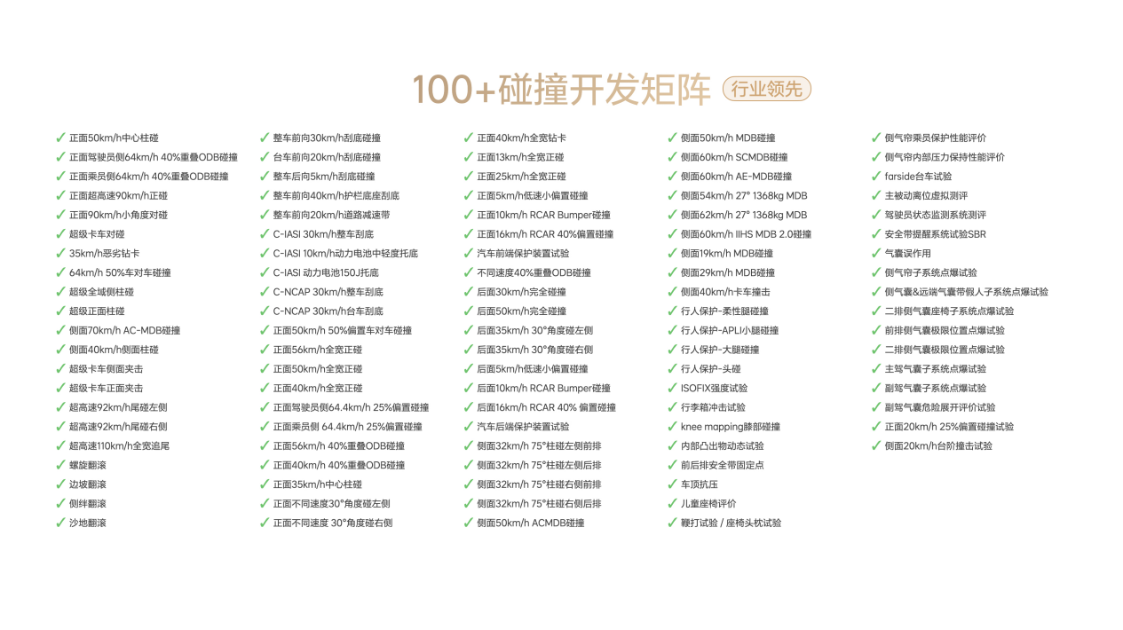理想i8能够提前满足C-IASI新规程测试要求,还源于理想汽车构建的全场景碰撞测试矩阵。理想汽车坚持认为安全开发不应满足“应试教育”,更需要充分考虑真实路况表现。除法规及认证要求的工况外,理想汽车测试矩阵涵盖360柱碰、全场景翻滚等真实路况中常见事故类型,并全面覆盖超过100项碰撞测试工况,企业标准远超行业标准,覆盖全场景用车安全。