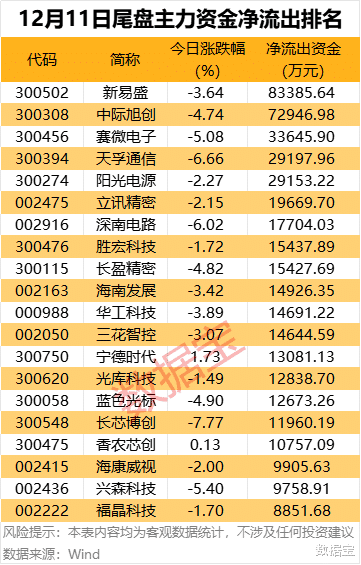尾盘主力资金净流出方面,新易盛、中际旭创净流出均超7亿元;赛微电子、天孚通信、阳光电源净流出均超2亿元。