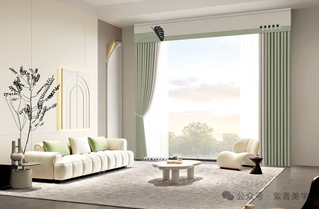 示例:浅灰色墙面搭配米白色窗帘,营造高级感。