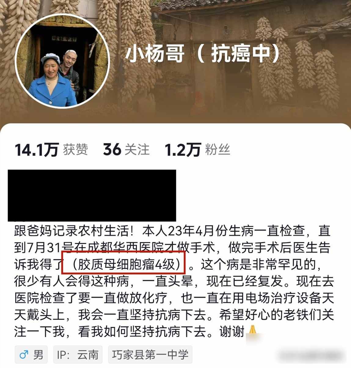 杨贵成是云南人,33岁,去年查出脑子里长了个瘤子。医生说这病特别难治,治了快两年,花光家里钱还借了几十万。后来他回农村养病,最后连路都走不了,只能坐轮椅。他老婆扔下他和女儿跑了。女儿才11岁,生日刚过没多久,爸爸就走了。