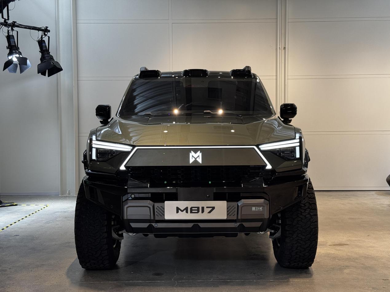 第一眼望去,M817的方正轮廓和宽厚车身依旧延续着东风猛士的军工基因——高耸的引擎盖、外扩的轮眉、接近直角的车身线条,处处透着“不好惹”的硬派气质。车身尺寸虽未公布具体数据,但从实车比例来看,轴距和离地间隙表现亮眼,预测会具备出色的通过性。