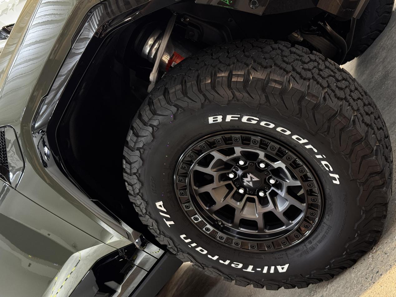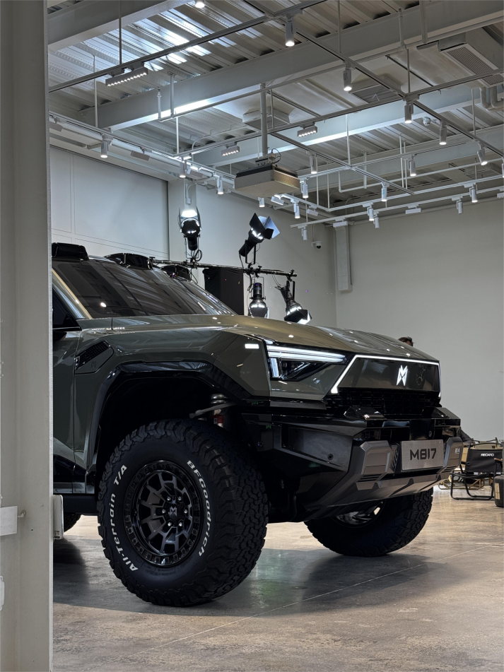 猛士M817的车身侧面姿态延续了猛士家族化设计,大尺寸轮包如同贲张的肌肉,适配35英寸大脚胎,整体看去力量感十足;后视镜采用极窄边框设计,降低风阻的同时提升视野范围。
