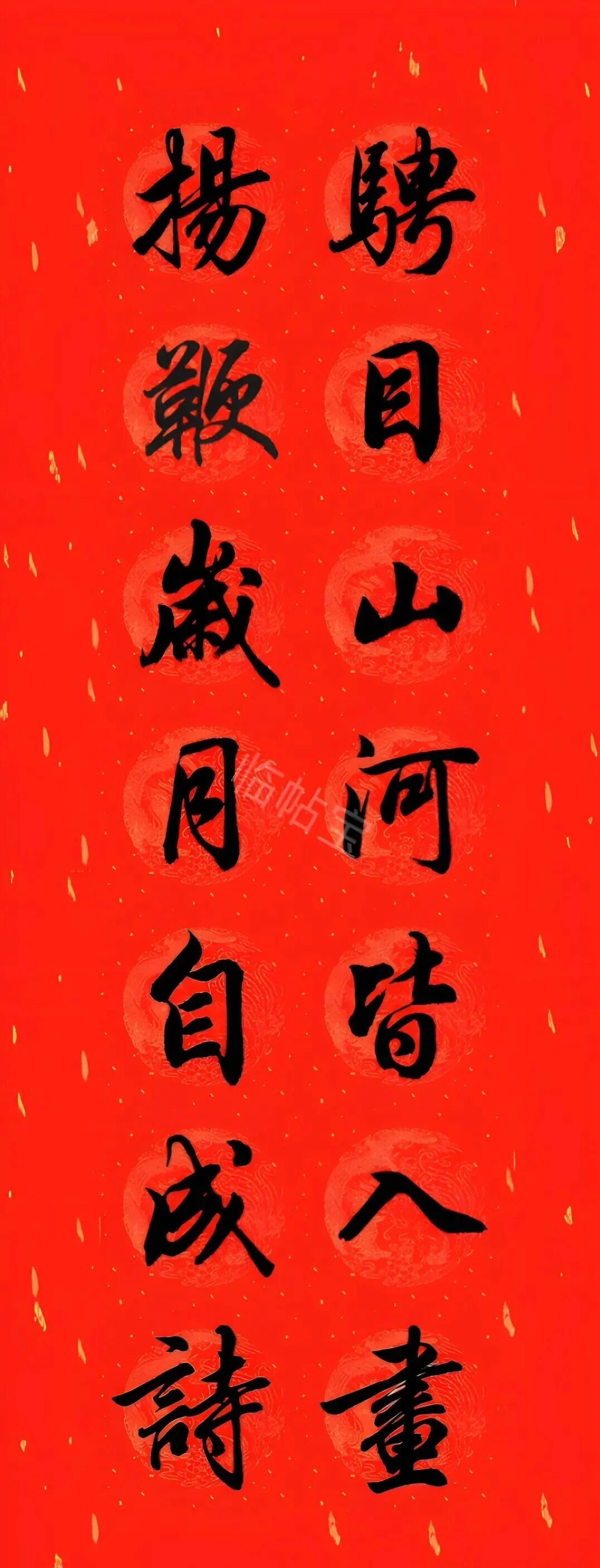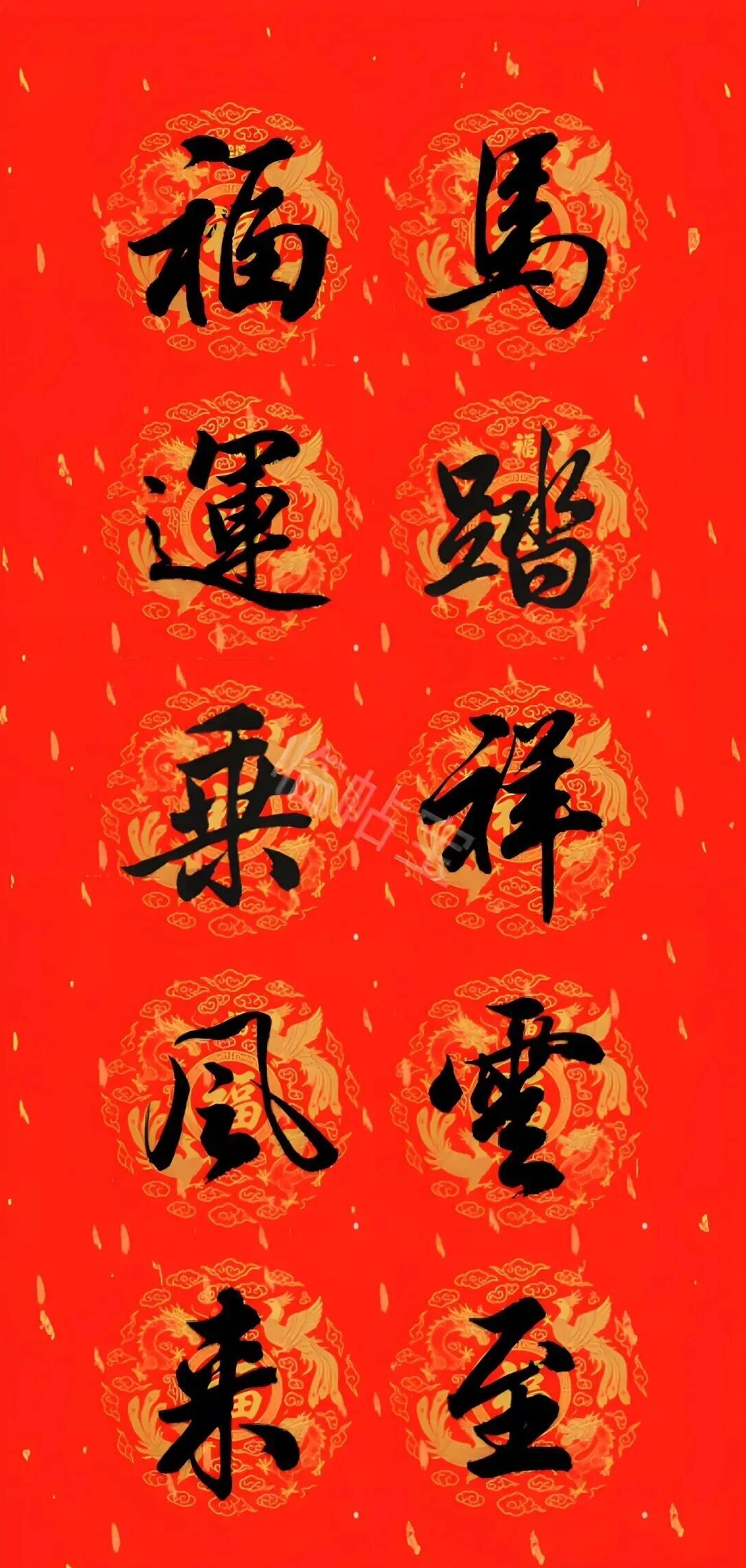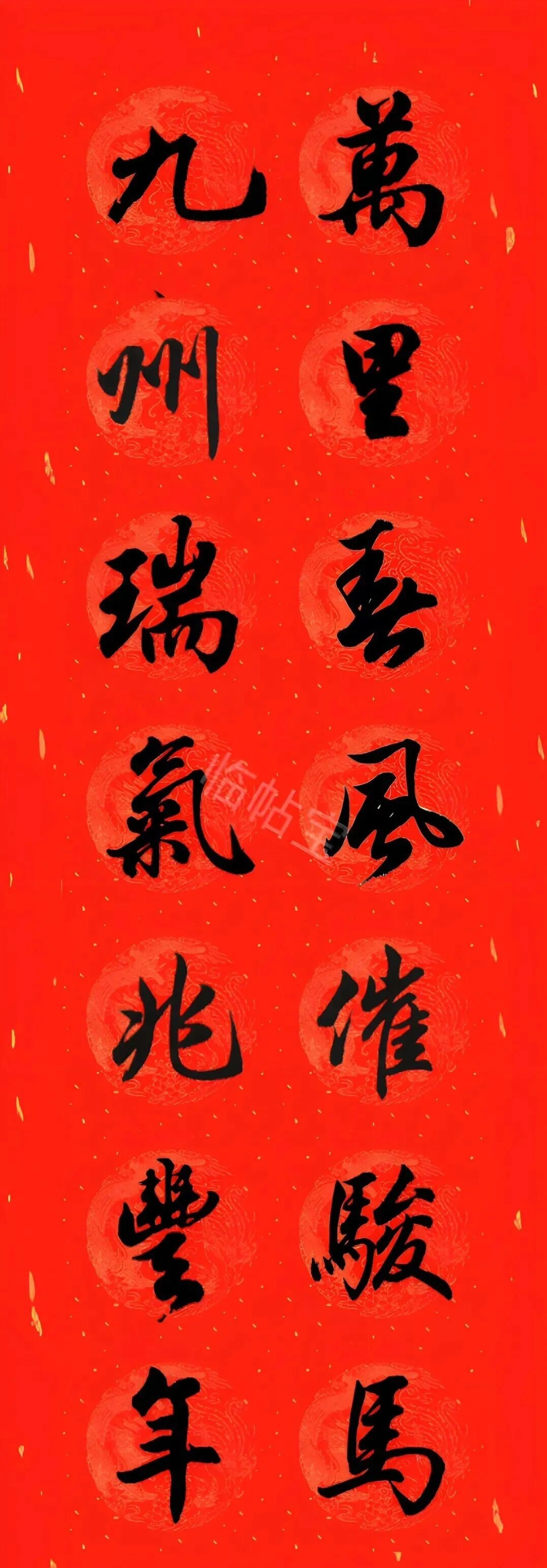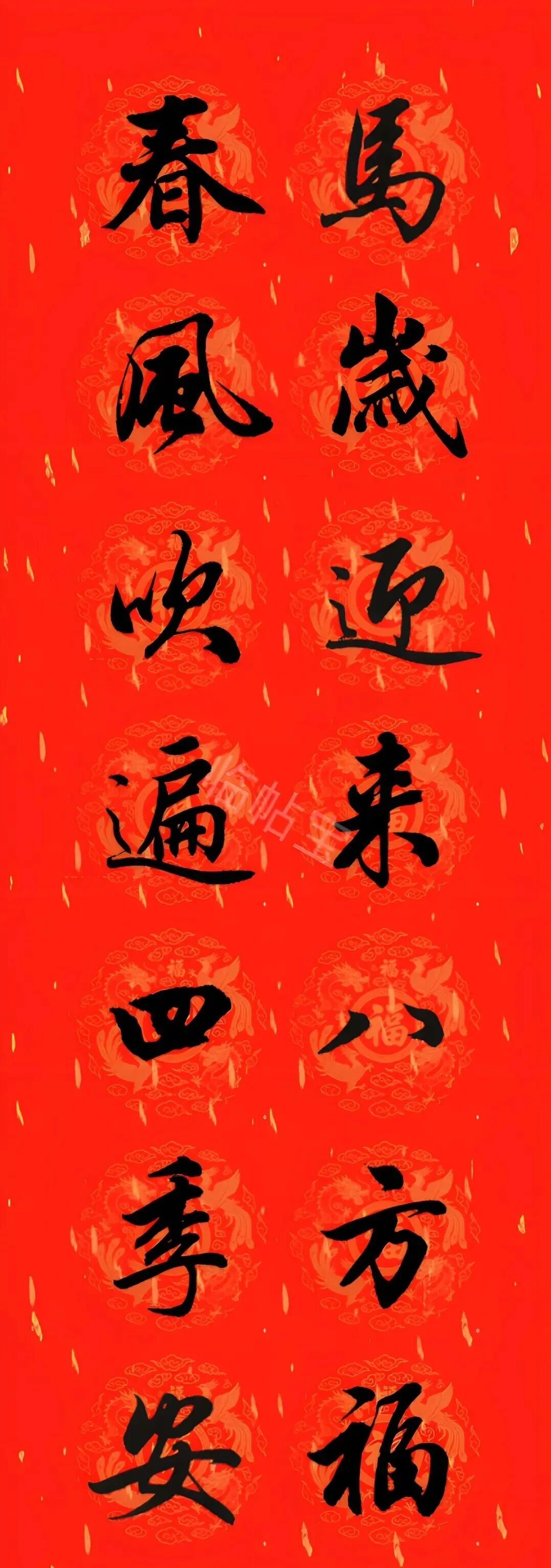 2026丙午马年,田英章行书集字春联:骏骨丰筋,行笔如走马,联句含马意,红纸金粉,九幅成组,宜贴宜藏,提前练写,年味与墨香并驰。