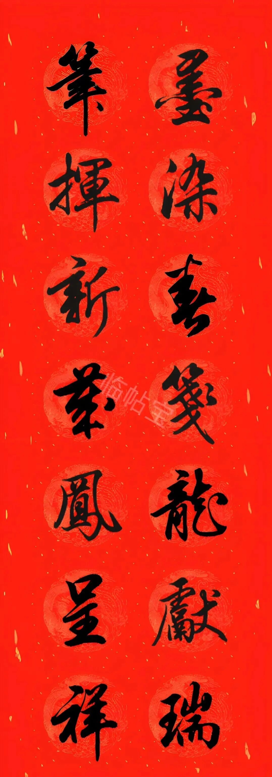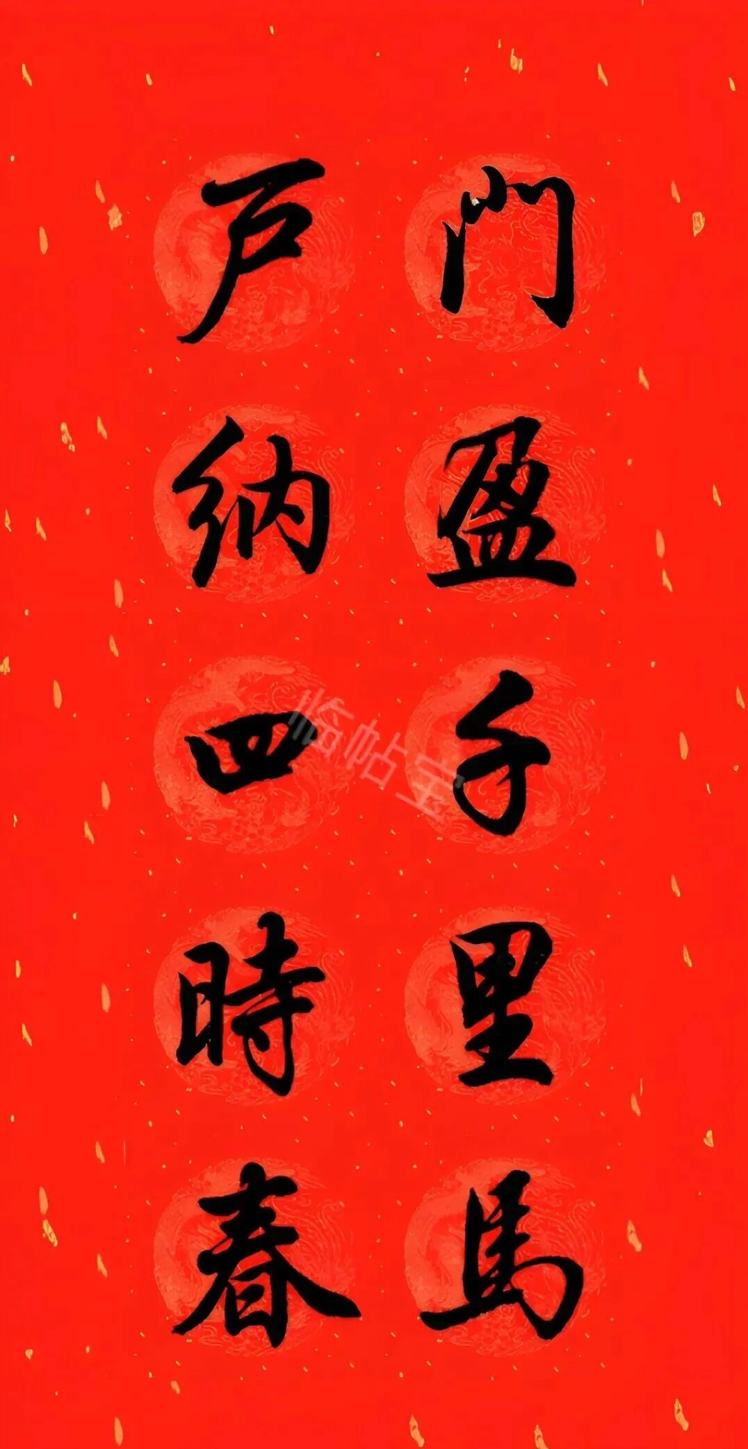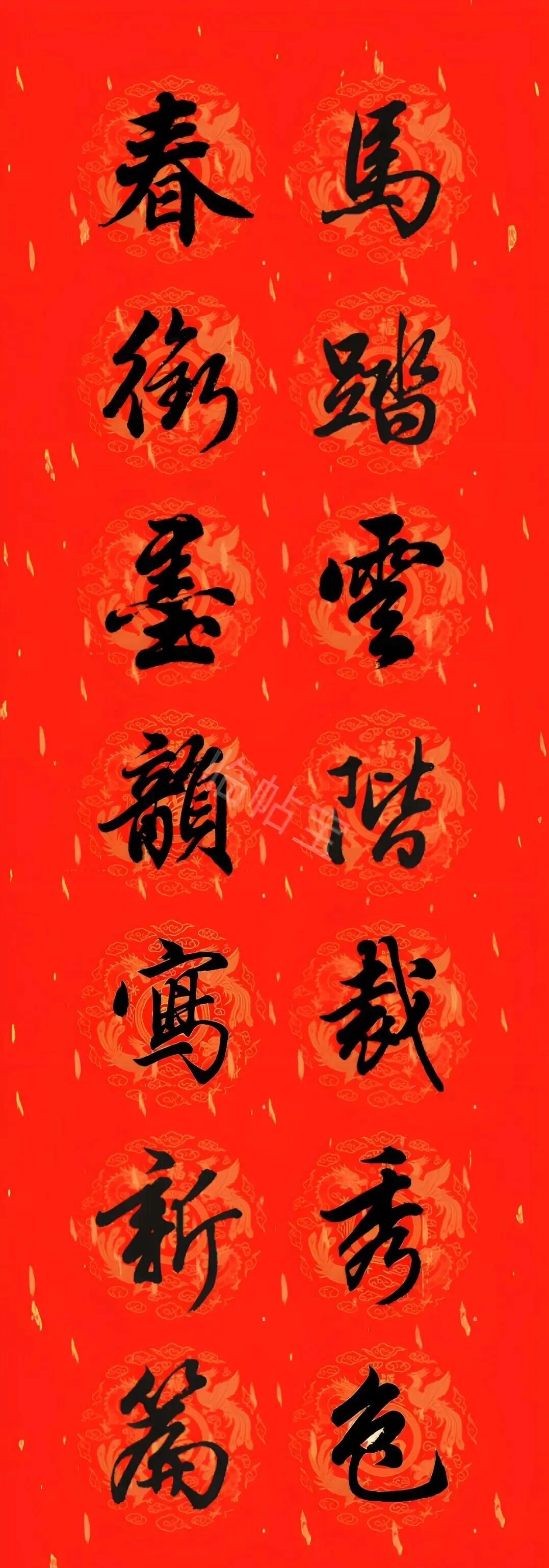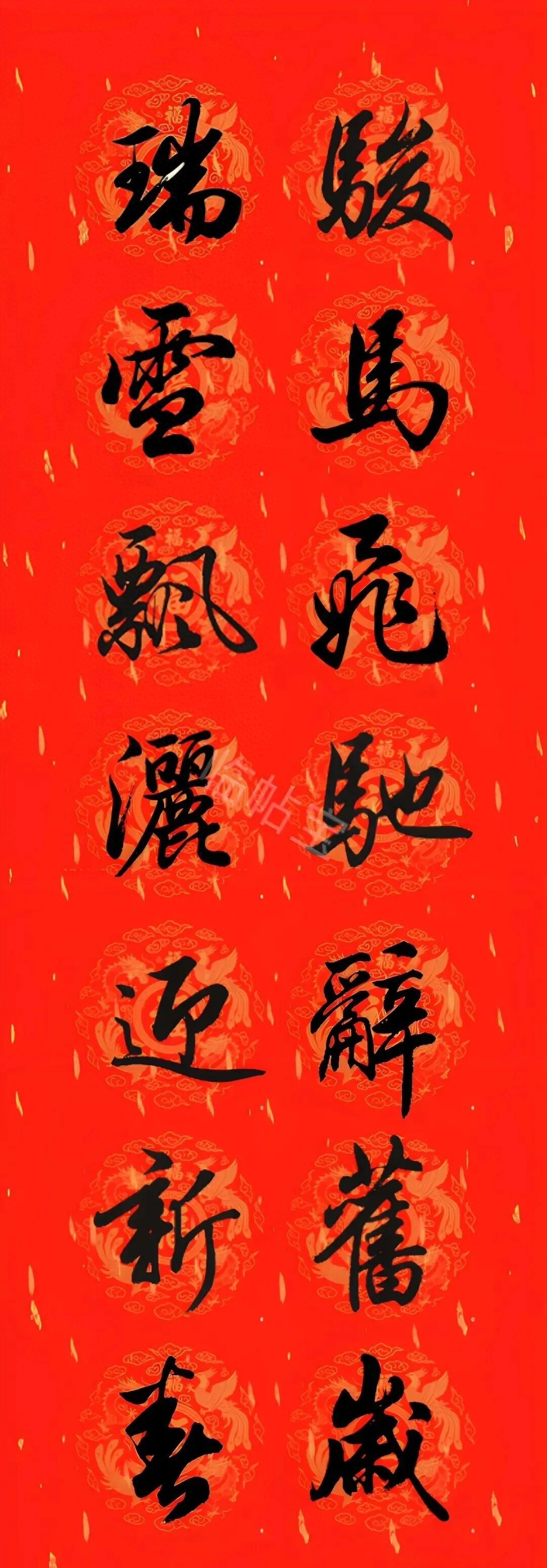 2026丙午马年,田英章行书集字春联:骏骨丰筋,行笔如走马,联句含马意,红纸金粉,九幅成组,宜贴宜藏,提前练写,年味与墨香并驰。