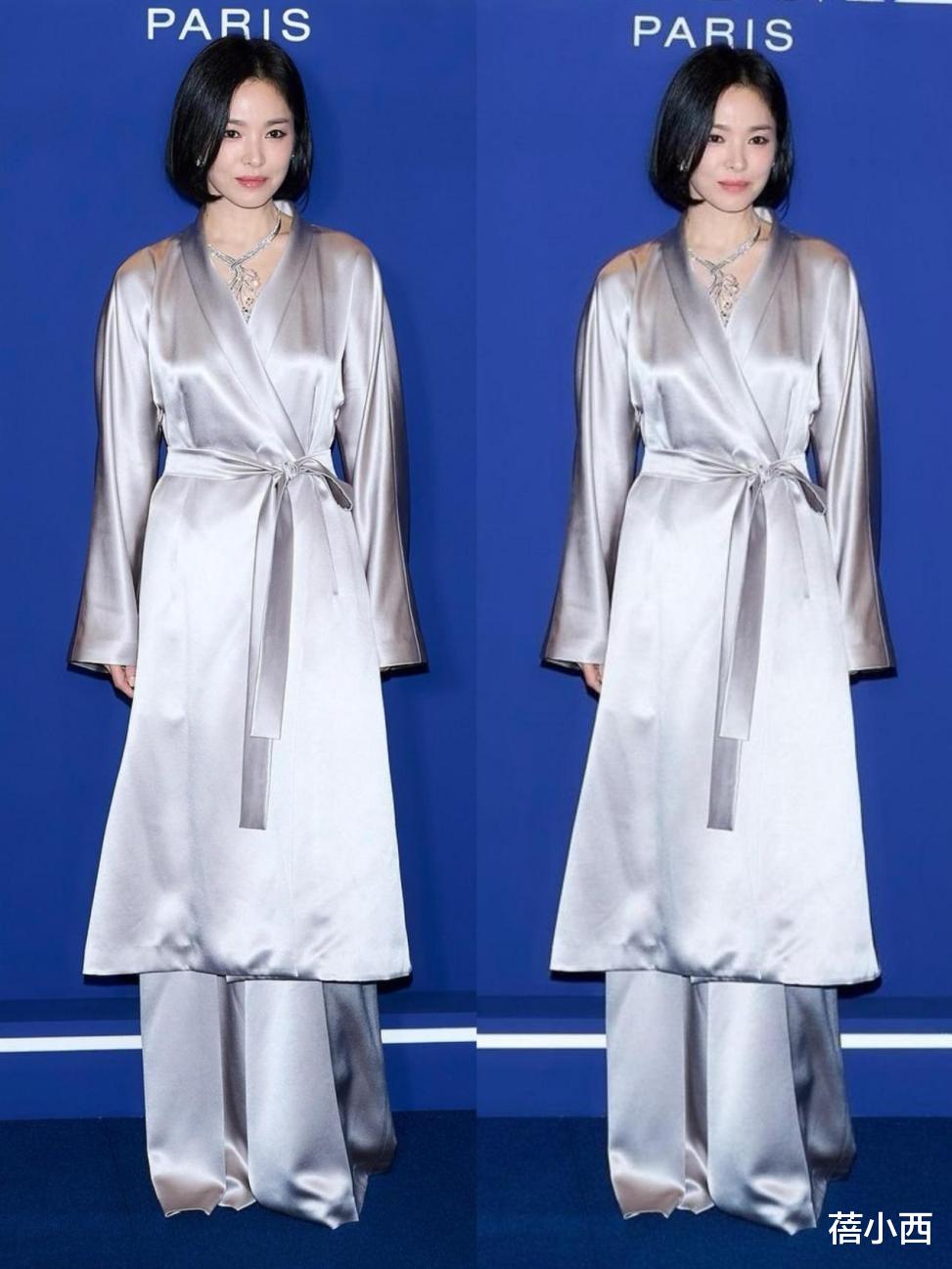 这件具有光泽感的大衣看到的第一眼像“睡衣”,面料摸上去十分光滑有质感。领口是v型,再加上面料垂坠感良好,如果面料轻薄,睡觉穿估计也很舒服。大衣长度过了宋慧乔的膝盖,腰间还配有同色系腰带,随便一系便能彰显小蛮腰。