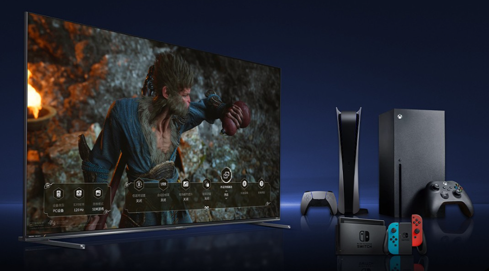 实测《黑神话:悟空》游戏画面,E8S的高速场景无拖影,色彩边缘清晰,而SQD电视在快速移动画面中会出现色彩串扰,影响观感。
