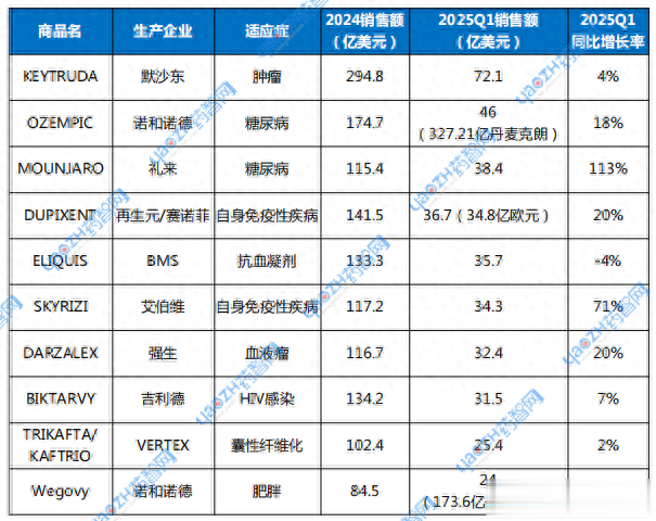 表1 2025Q1畅销药TOP10