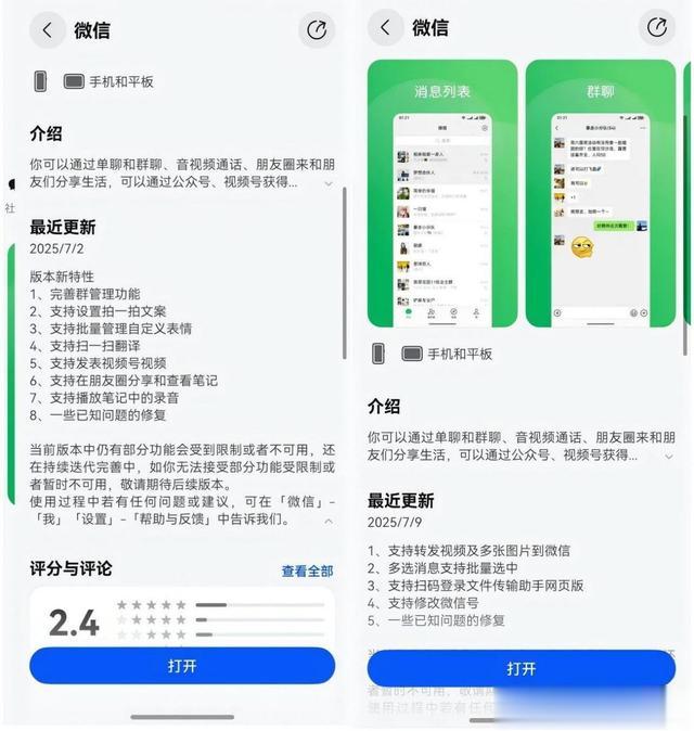 鸿蒙用户快速增长,微信也在快速更新迭代。从6月9日到7月9日,一个月左右的时间,鸿蒙版微信正式版更新4次,几乎次次都的重大更新,4次更新新增功能22项,平均每次新增5项以上。7月9日更新后,目前鸿蒙版微信已经可以满足绝大部分用户的使用需求,随着功能的不断完善,评分也在快速提升,目前评分4.0。