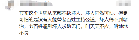 还有位网友也感慨,其实这个世界从来不缺坏人,坏人固然可恨,但更可怕的是没有人替老百姓主持公道,坏人得不到惩罚,老百姓遇到坏人求助无门,叫天天不应,叫地地不灵。