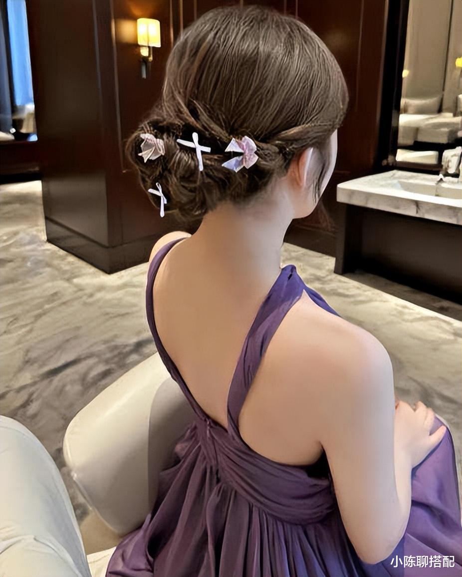不仅不会和穿搭的紫色连衣裙产生冲突,而且还能够起到提亮的效果。浅紫色蝴蝶结小发饰,可以带来梦幻少女感,让整个穿搭浪漫又甜美。