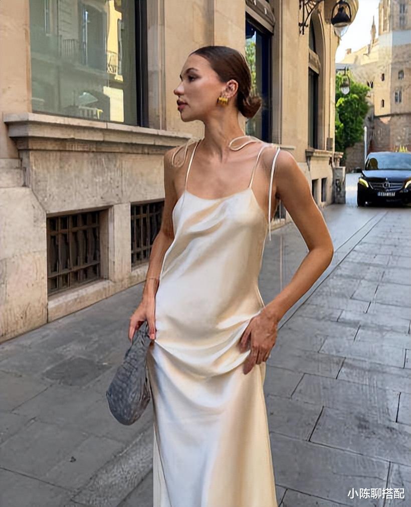 40岁女人即使臀部有赘肉,也可以通过醋酸连衣裙的垂坠感,起到遮盖效果。比如:米色细吊带醋酸连衣裙搭配左侧低丸子,太有女人风情和气质。