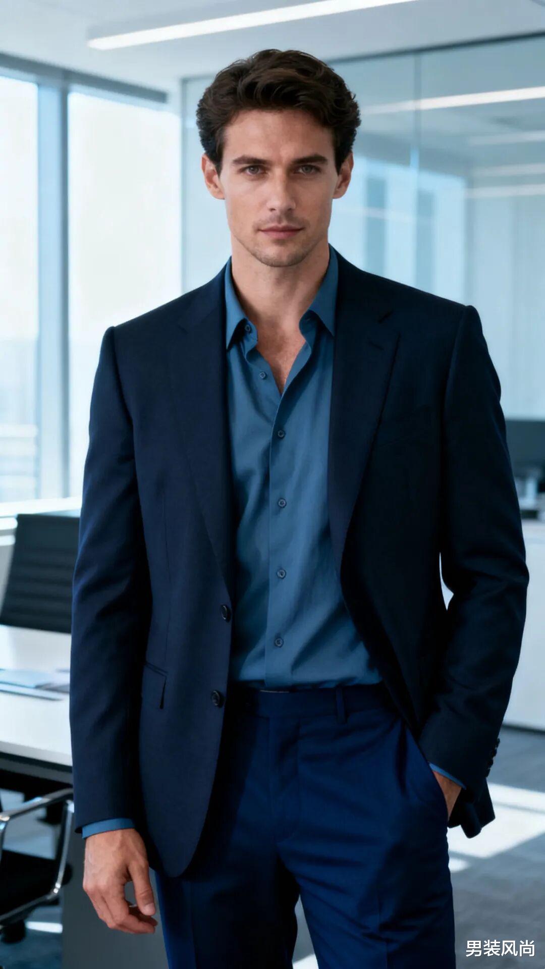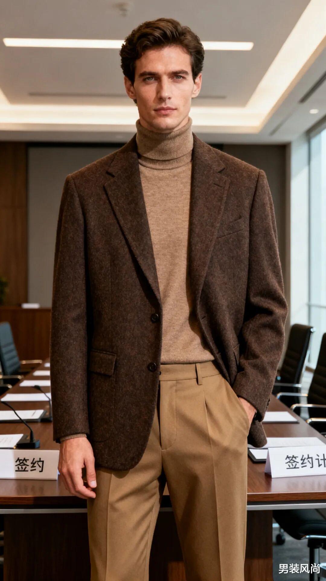 • 同色系搭配:这是最稳妥的高级感搭配方式。例如深棕咖西装+浅棕咖高领内搭+卡其色西裤,通过颜色深浅的递进,打造层次感,整体视觉统一且显高级,适合重要商务会议、签约仪式等正式场合;藏青西装+雾霾蓝衬衫+深蓝色西裤,冷色调的碰撞沉稳大气,又不会显得单调。