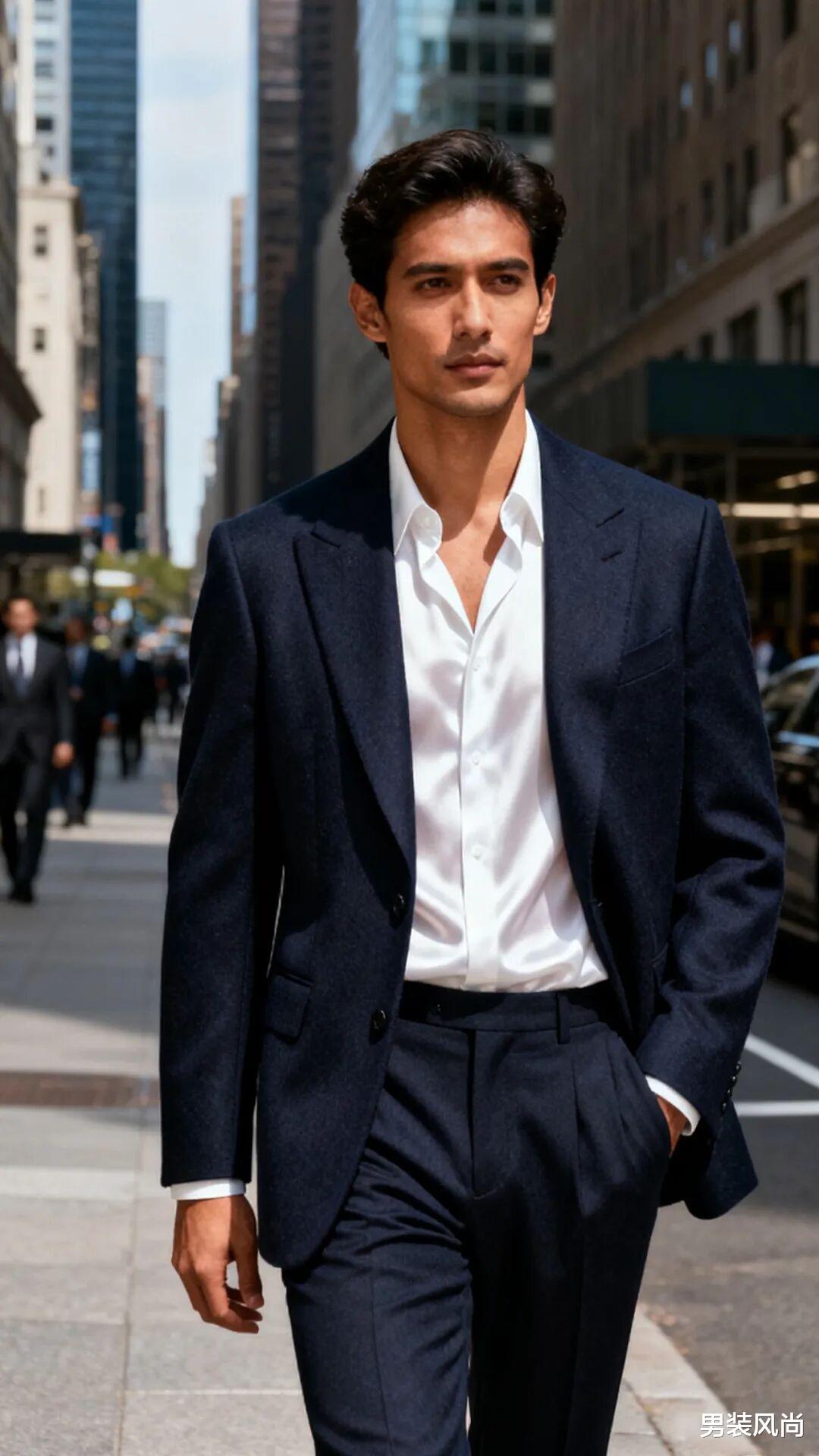 • 真丝衬衫:如果需要更正式的造型,真丝衬衫是首选。它的光泽感柔和,比棉质衬衫更显高级,且透气性好,即使长时间穿着也不会闷热。颜色选择白色、浅灰色、雾霾蓝,搭配西装沉稳大气。记得将衬衫下摆完全塞进裤子,打造干净利落的线条。